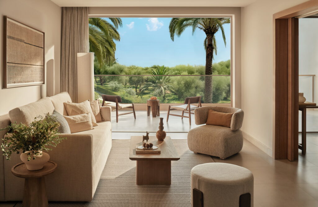 In dieser Gartensuite trifft Stil auf Großzügigkeit. Die Räumlichkeiten erstrecken sich über das separate Schlafzimmer und den Wohnraum bis hin zum üppigen Garten. Perfekt für Familien geeignet, verbindet sie Komfort mit elegantem und dezentem Design.
