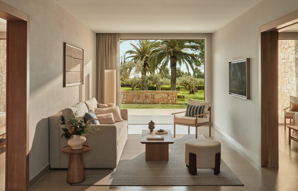 Οι μπλε και κρεμ εσωτερικοί χώροι συναντούν τους σμαραγδένιους κήπους και τον βάλσαμο κοβαλτίου ουρανό σε αυτή την παραθαλάσσια Deluxe σουίτα, που βρίσκεται στις ηλιόλουστες ακτές της Χαλκιδικής. Απολαύστε την Unconditional Luxury και την απομονωμένη ιδιωτικότητα.