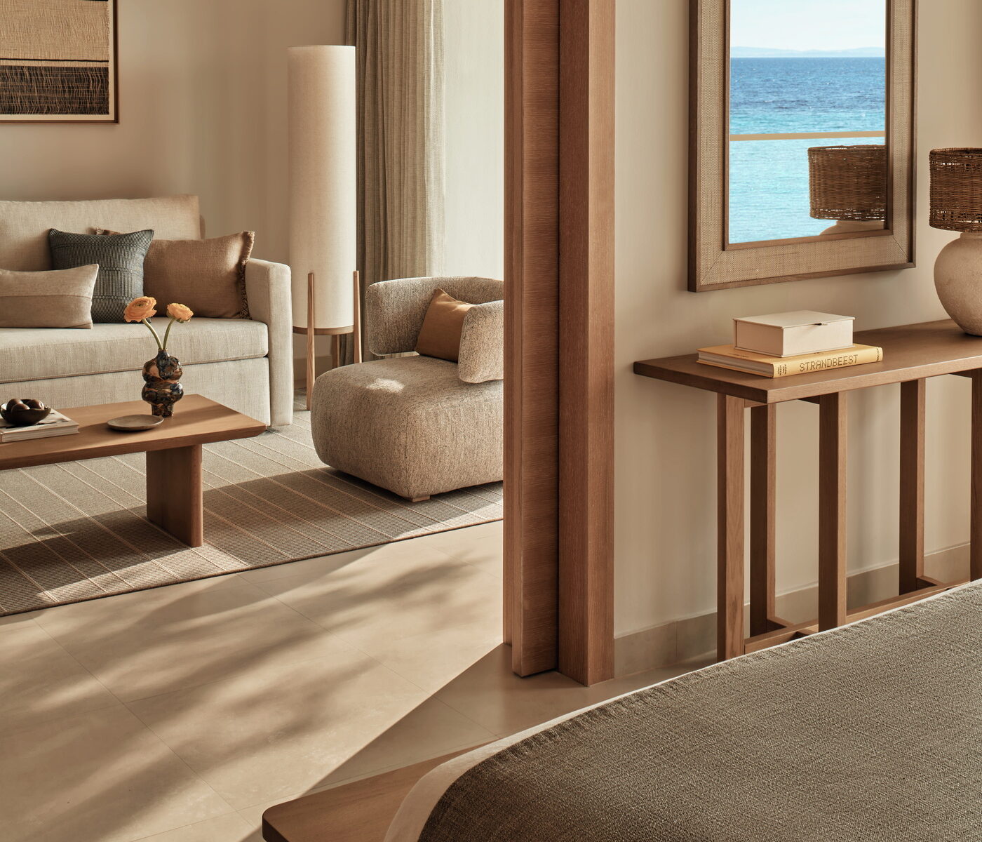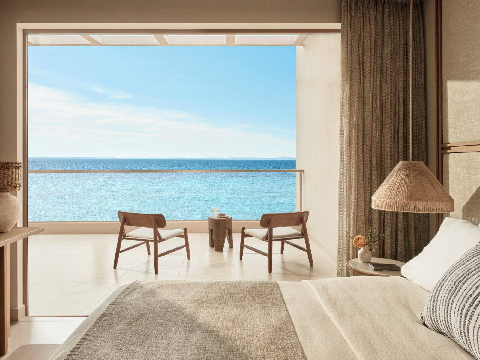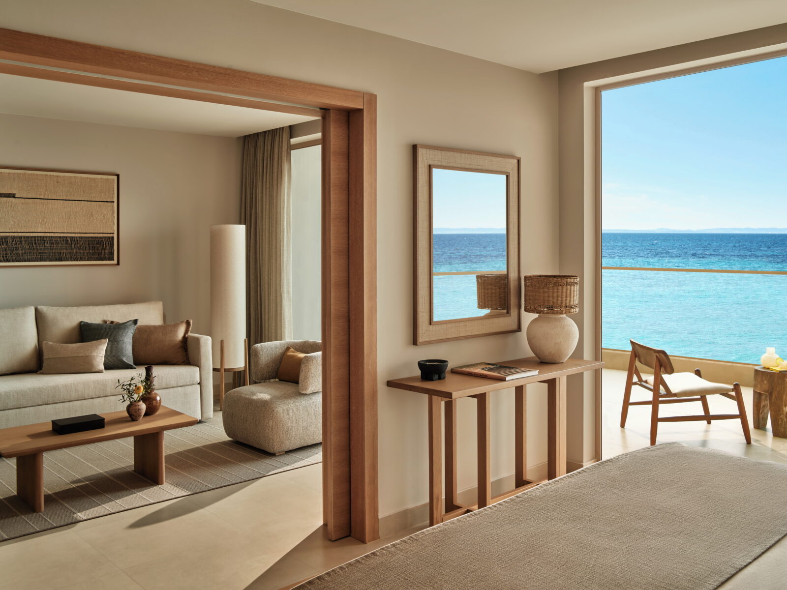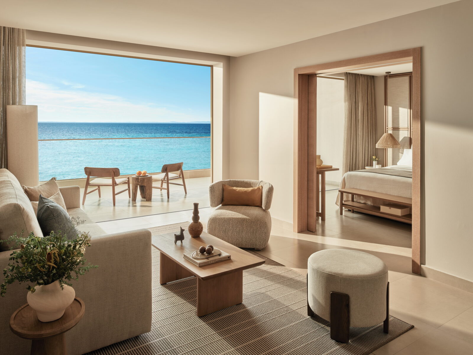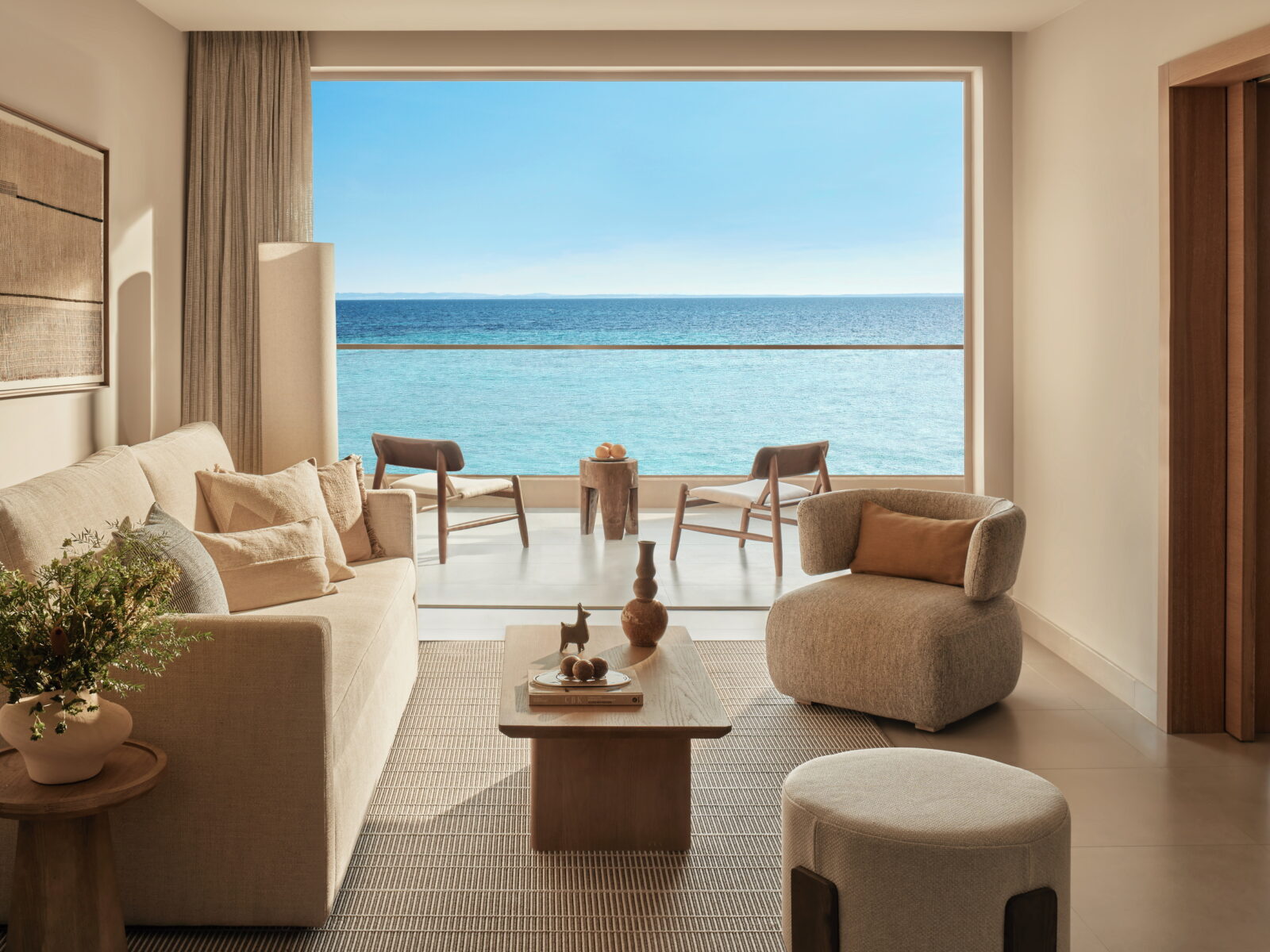 With sweeping sea views and a privileged location set right on the coast, this elevated suite is designed to comfortably sleep five. Immerse yourself in a haven of serene coffee-and-cream decor and natural textiles, opening out onto your expansive, furnished balcony. Large windows unveil serene sea views and flood the space with light.