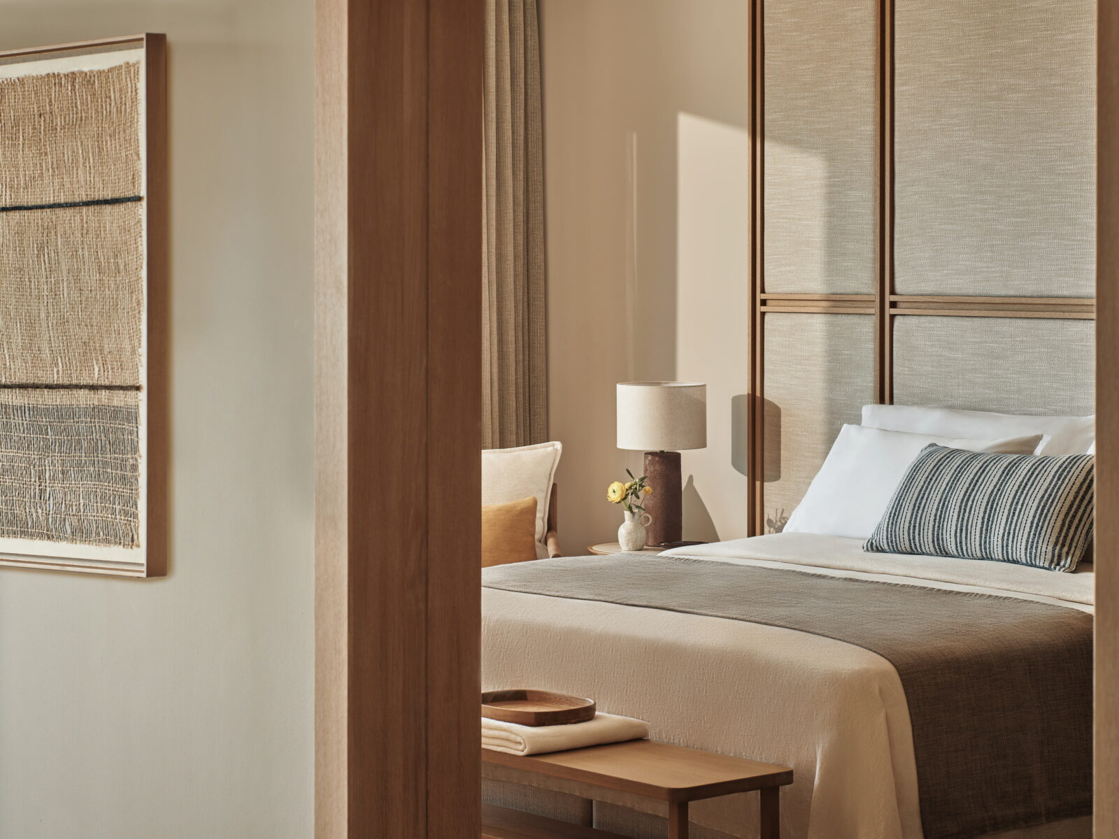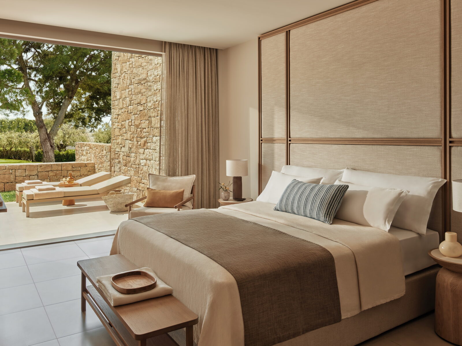An expansive, sun-drenched sanctuary, where the softly luxurious interiors open onto a secluded garden. This idyllic family escape forms a blissful haven for two adults and three children with a serene bedroom and adjoining lounge decorated with a palette of soft cream and mocha hues, creating a serene ambience where nature takes centre stage.