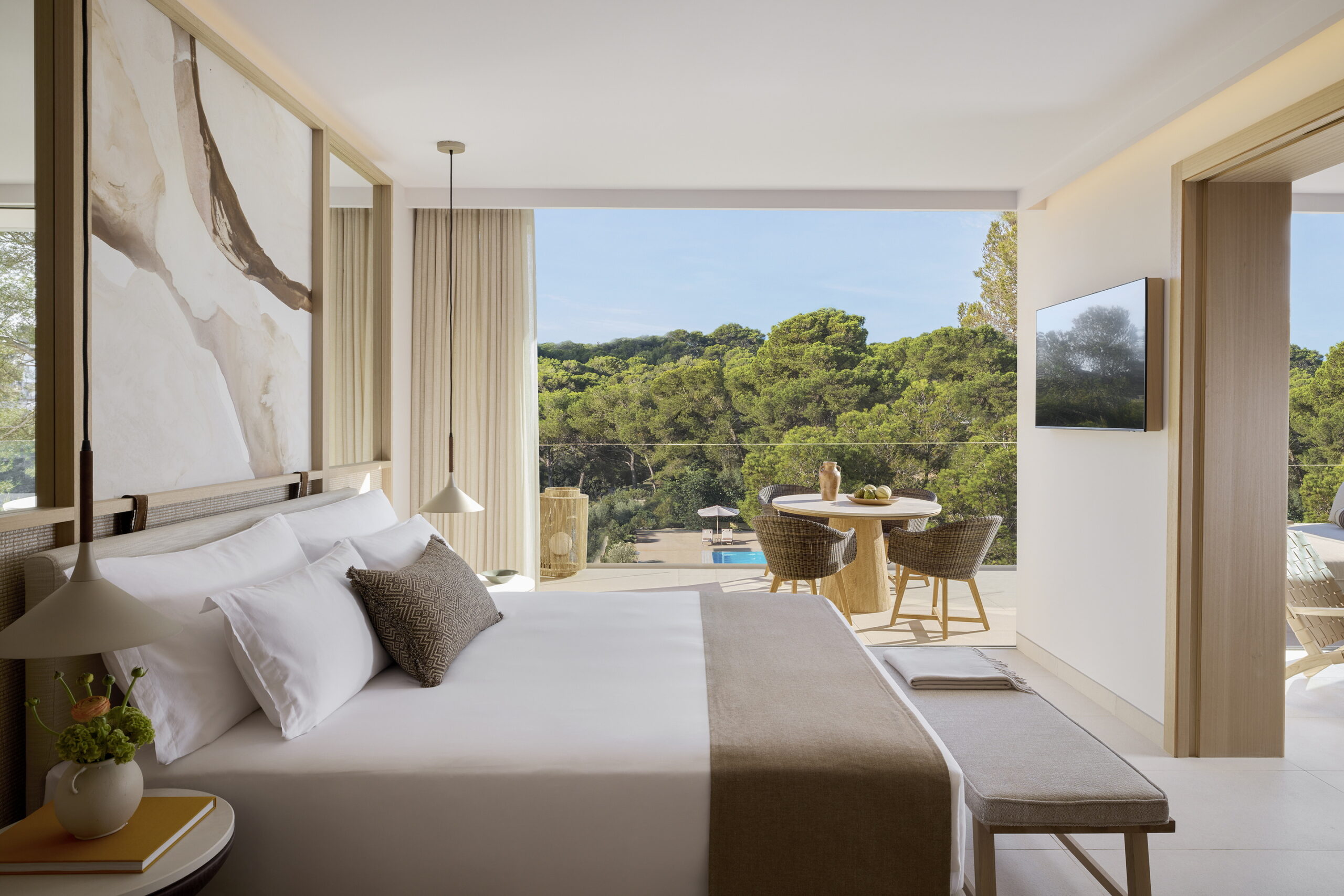 This refined family suite offers a spacious retreat with a separate bedroom and lounge, enhanced by wide windows and a private balcony framing tranquil views of the resort pool. Designed for up to four guests, it combines subtle sophistication with modern convenience.